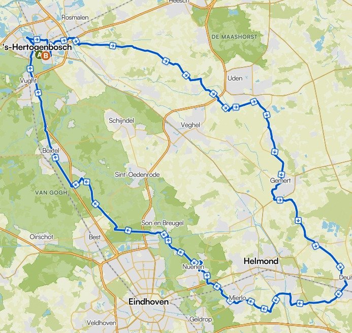 Na zo'n 70 kilometer komen we aan in Mierlo, bij Café de Koffer, voor een pauze. Daar krijgen we koffie of thee en een stuk gebak. Naar verwachting zijn we rond 15.30 uur terug in 's-Hertogenbosch, bij The Dukes. Naast een hapje en een drankje kunnen geïnteresseerden hier ook de finish van de wielerklassieker Parijs-Roubaix zien.